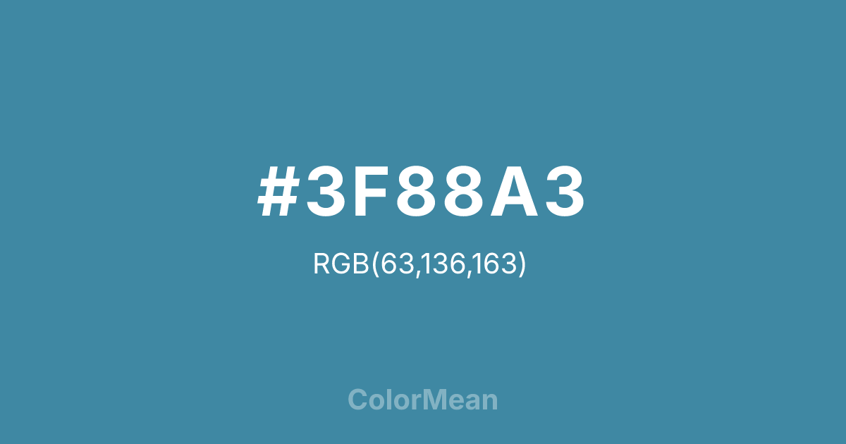 #3F88A3 RGB value is (63, 136, 163). The hex color red value is 63, green is 136, and blue is 163. Its HSL format shows a hue of 196°, saturation of 44 percent, and lightness of 44 percent. The CMYK process values are 61 percent, 17 percent, 0 percent, 36 percent.