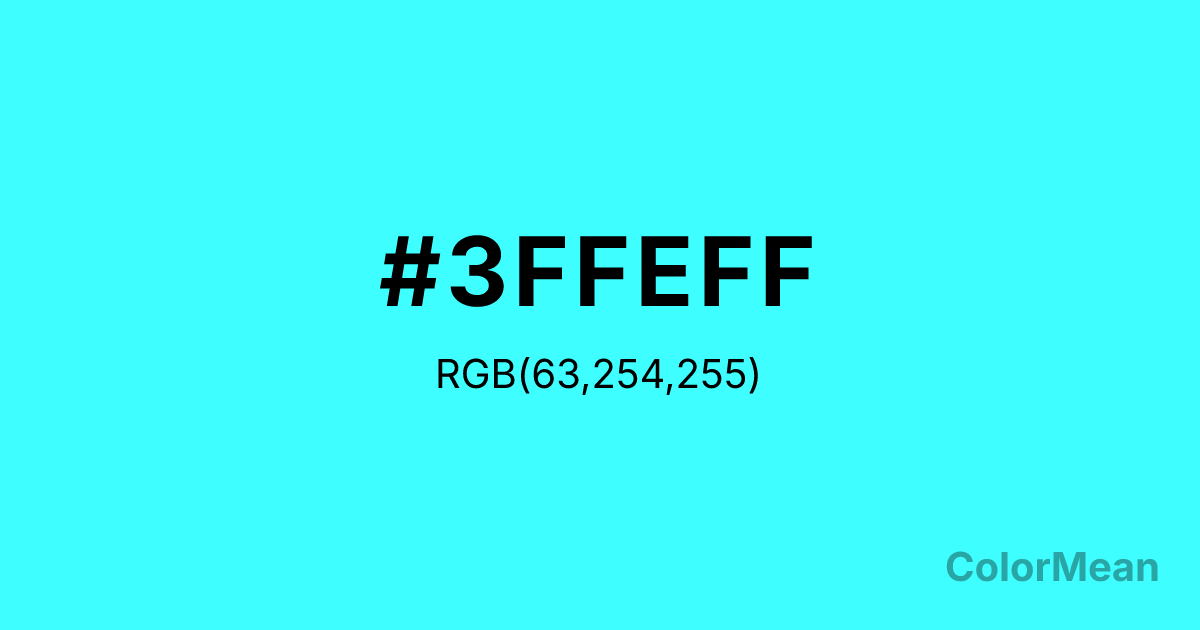 #3FFEFF RGB value is (63, 254, 255). The hex color red value is 63, green is 254, and blue is 255. Its HSL format shows a hue of 180°, saturation of 100 percent, and lightness of 62 percent. The CMYK process values are 75 percent, 0 percent, 0 percent, 0 percent.