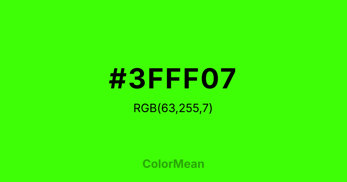 #3FFF07 RGB value is (63, 255, 7). The hex color red value is 63, green is 255, and blue is 7. Its HSL format shows a hue of 106°, saturation of 100 percent, and lightness of 51 percent. The CMYK process values are 75 percent, 0 percent, 97 percent, 0 percent.