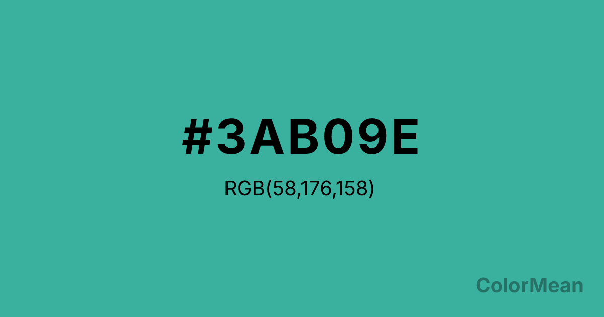 Keppel (#3AB09E) RGB value is (58, 176, 158). The hex color red value is 58, green is 176, and blue is 158. Its HSL format shows a hue of 171°, saturation of 50 percent, and lightness of 46 percent. The CMYK process values are 67 percent, 0 percent, 10 percent, 31 percent.