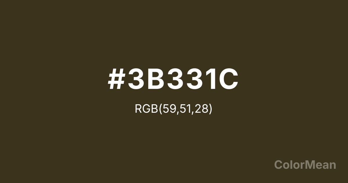 Pullman Green (#3B331C) RGB value is (59, 51, 28). The hex color red value is 59, green is 51, and blue is 28. Its HSL format shows a hue of 45°, saturation of 36 percent, and lightness of 17 percent. The CMYK process values are 0 percent, 14 percent, 53 percent, 77 percent.