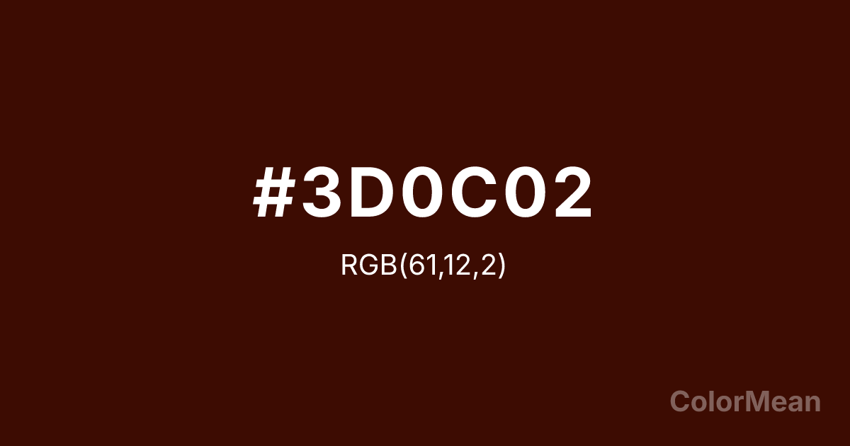 Black Bean (#3D0C02) RGB value is (61, 12, 2). The hex color red value is 61, green is 12, and blue is 2. Its HSL format shows a hue of 10°, saturation of 94 percent, and lightness of 12 percent. The CMYK process values are 0 percent, 80 percent, 97 percent, 76 percent.