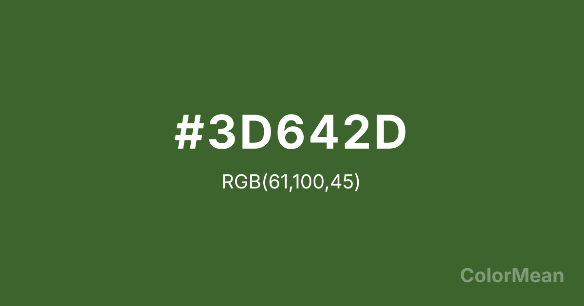 Fern Green (#3D642D) RGB value is (61, 100, 45). The hex color red value is 61, green is 100, and blue is 45. Its HSL format shows a hue of 103°, saturation of 38 percent, and lightness of 28 percent. The CMYK process values are 39 percent, 0 percent, 55 percent, 61 percent.
