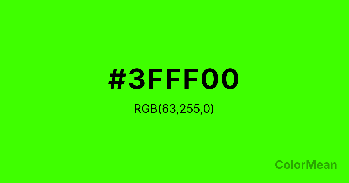 Harlequin (#3FFF00) RGB value is (63, 255, 0). The hex color red value is 63, green is 255, and blue is 0. Its HSL format shows a hue of 105°, saturation of 100 percent, and lightness of 50 percent. The CMYK process values are 75 percent, 0 percent, 100 percent, 0 percent.