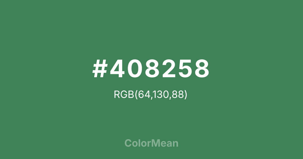 #408258 RGB value is (64, 130, 88). The hex color red value is 64, green is 130, and blue is 88. Its HSL format shows a hue of 142°, saturation of 34 percent, and lightness of 38 percent. The CMYK process values are 51 percent, 0 percent, 32 percent, 49 percent.