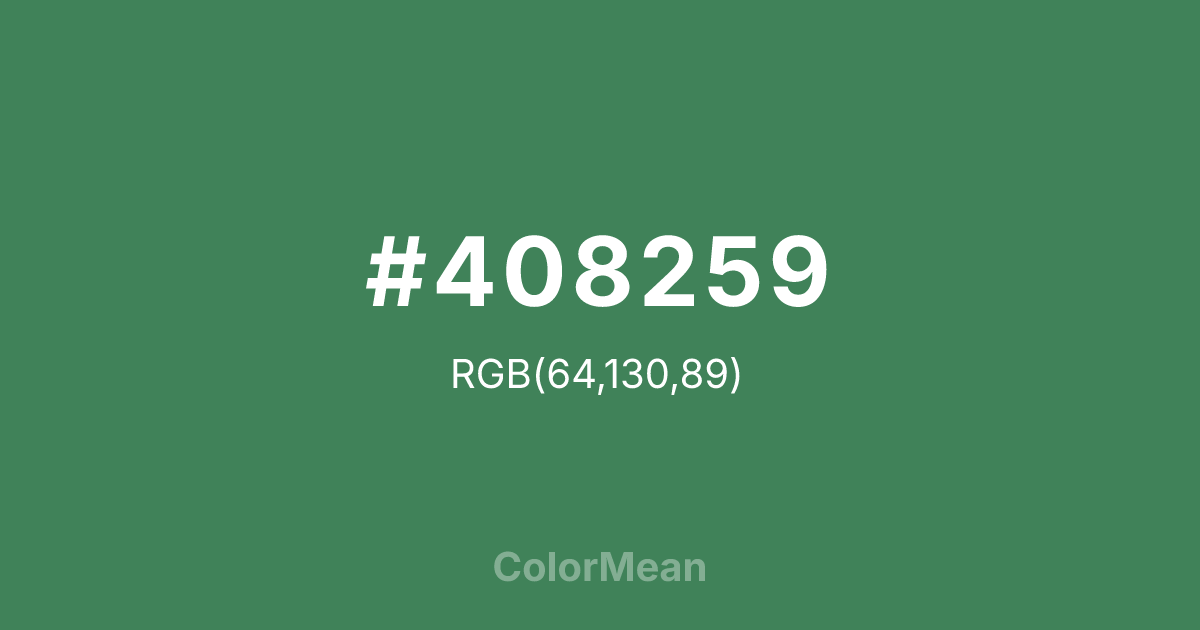 #408259 RGB value is (64, 130, 89). The hex color red value is 64, green is 130, and blue is 89. Its HSL format shows a hue of 143°, saturation of 34 percent, and lightness of 38 percent. The CMYK process values are 51 percent, 0 percent, 32 percent, 49 percent.
