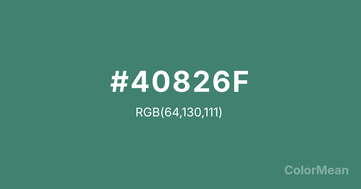 #40826F RGB value is (64, 130, 111). The hex color red value is 64, green is 130, and blue is 111. Its HSL format shows a hue of 163°, saturation of 34 percent, and lightness of 38 percent. The CMYK process values are 51 percent, 0 percent, 15 percent, 49 percent.