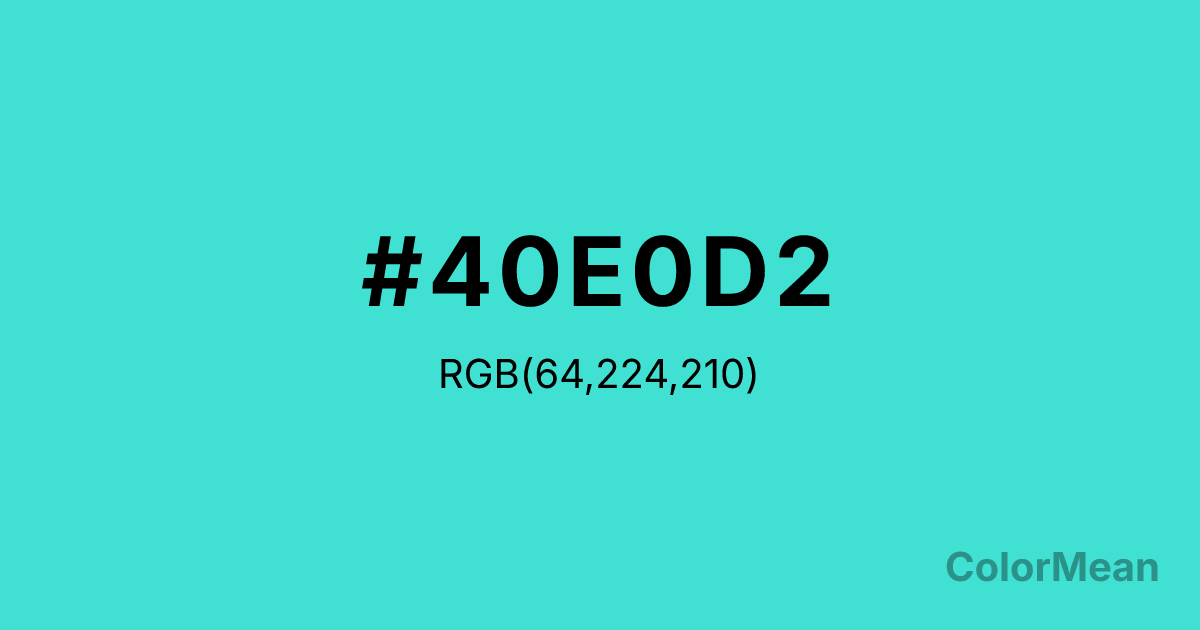 #40E0D2 RGB value is (64, 224, 210). The hex color red value is 64, green is 224, and blue is 210. Its HSL format shows a hue of 175°, saturation of 72 percent, and lightness of 56 percent. The CMYK process values are 71 percent, 0 percent, 6 percent, 12 percent.