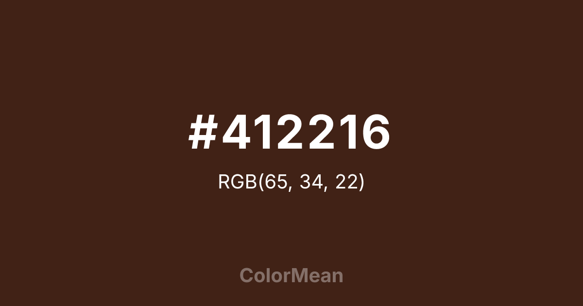 #412216 RGB value is (65, 34, 22). The hex color red value is 65, green is 34, and blue is 22. Its HSL format shows a hue of 17°, saturation of 49 percent, and lightness of 17 percent. The CMYK process values are 0 percent, 48 percent, 66 percent, 75 percent.