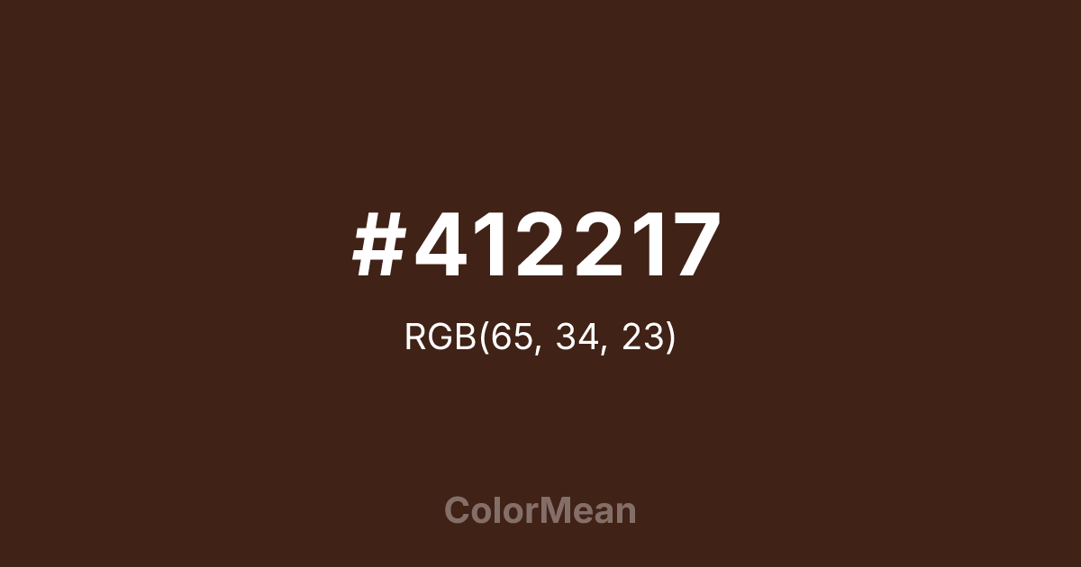 #412217 RGB value is (65, 34, 23). The hex color red value is 65, green is 34, and blue is 23. Its HSL format shows a hue of 16°, saturation of 48 percent, and lightness of 17 percent. The CMYK process values are 0 percent, 48 percent, 65 percent, 75 percent.