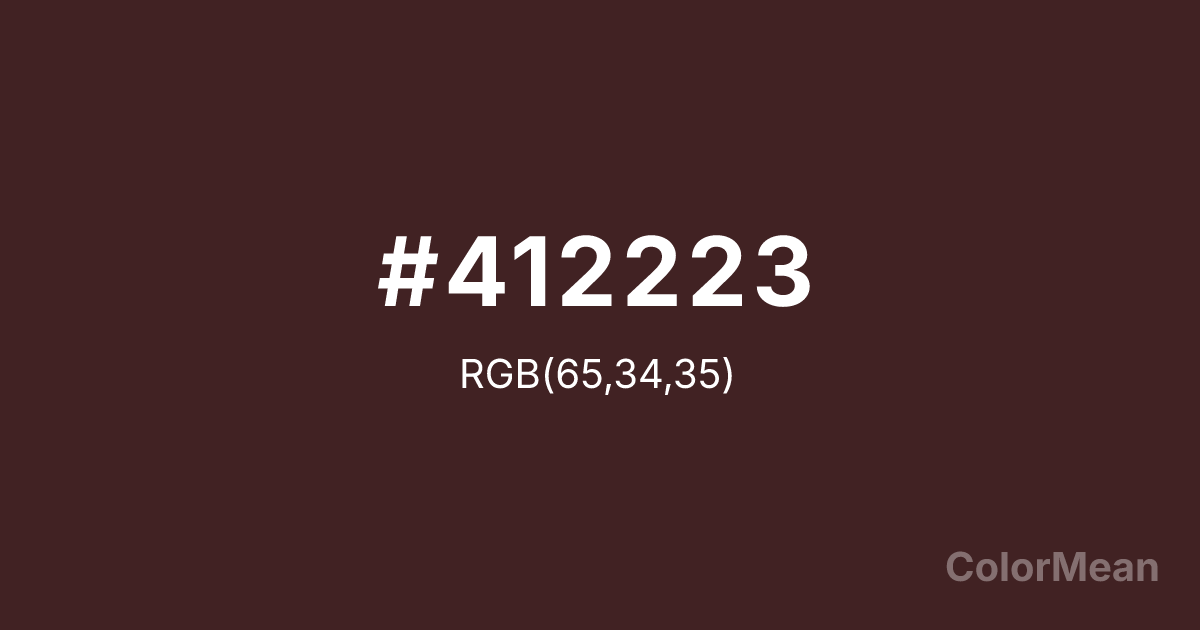 #412223 RGB value is (65, 34, 35). The hex color red value is 65, green is 34, and blue is 35. Its HSL format shows a hue of 358°, saturation of 31 percent, and lightness of 19 percent. The CMYK process values are 0 percent, 48 percent, 46 percent, 75 percent.
