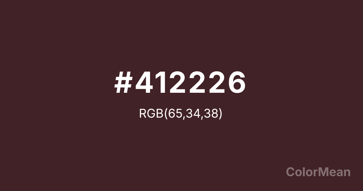 #412226 RGB value is (65, 34, 38). The hex color red value is 65, green is 34, and blue is 38. Its HSL format shows a hue of 352°, saturation of 31 percent, and lightness of 19 percent. The CMYK process values are 0 percent, 48 percent, 42 percent, 75 percent.
