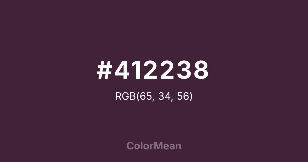 #412238 RGB value is (65, 34, 56). The hex color red value is 65, green is 34, and blue is 56. Its HSL format shows a hue of 317°, saturation of 31 percent, and lightness of 19 percent. The CMYK process values are 0 percent, 48 percent, 14 percent, 75 percent.