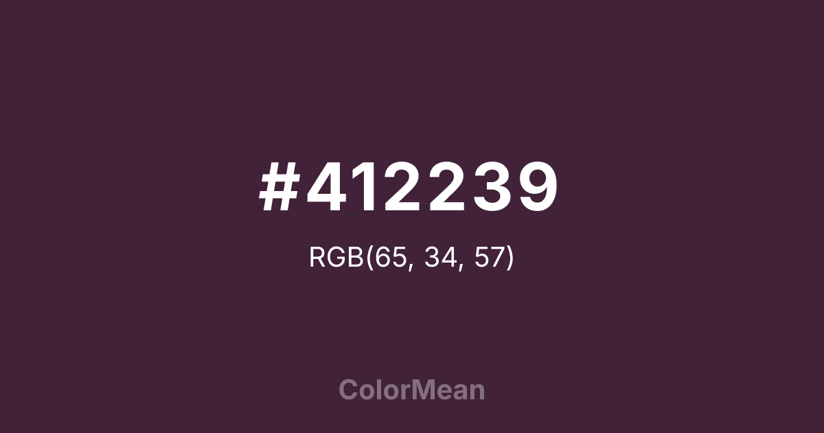 #412239 RGB value is (65, 34, 57). The hex color red value is 65, green is 34, and blue is 57. Its HSL format shows a hue of 315°, saturation of 31 percent, and lightness of 19 percent. The CMYK process values are 0 percent, 48 percent, 12 percent, 75 percent.