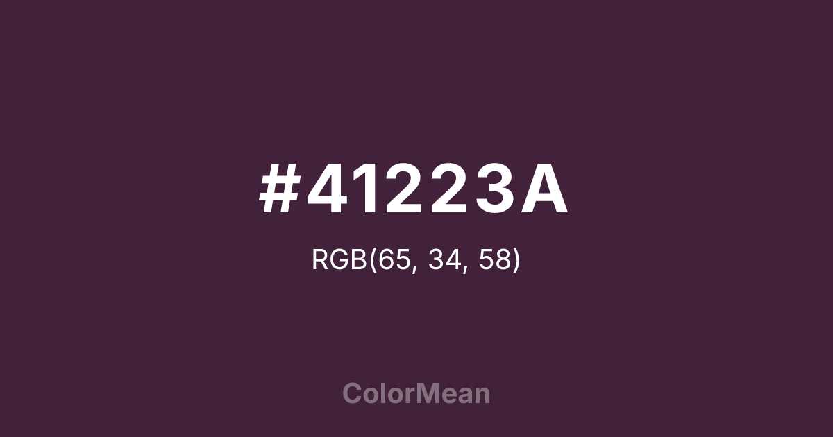 #41223A RGB value is (65, 34, 58). The hex color red value is 65, green is 34, and blue is 58. Its HSL format shows a hue of 314°, saturation of 31 percent, and lightness of 19 percent. The CMYK process values are 0 percent, 48 percent, 11 percent, 75 percent.