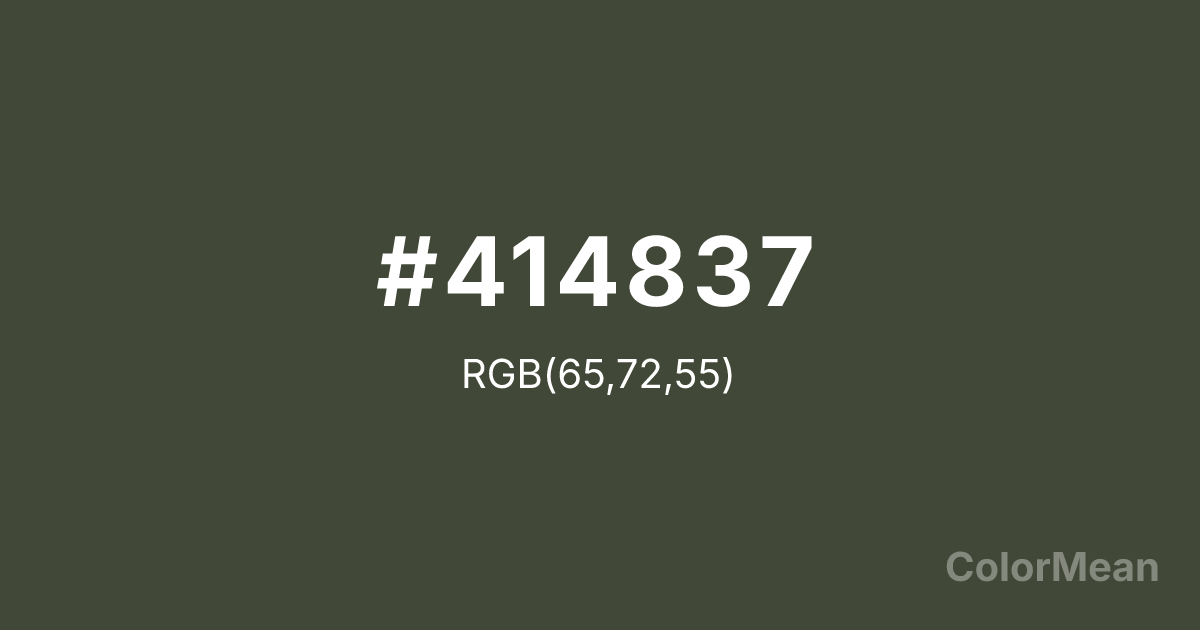 #414837 RGB value is (65, 72, 55). The hex color red value is 65, green is 72, and blue is 55. Its HSL format shows a hue of 85°, saturation of 13 percent, and lightness of 25 percent. The CMYK process values are 10 percent, 0 percent, 24 percent, 72 percent.