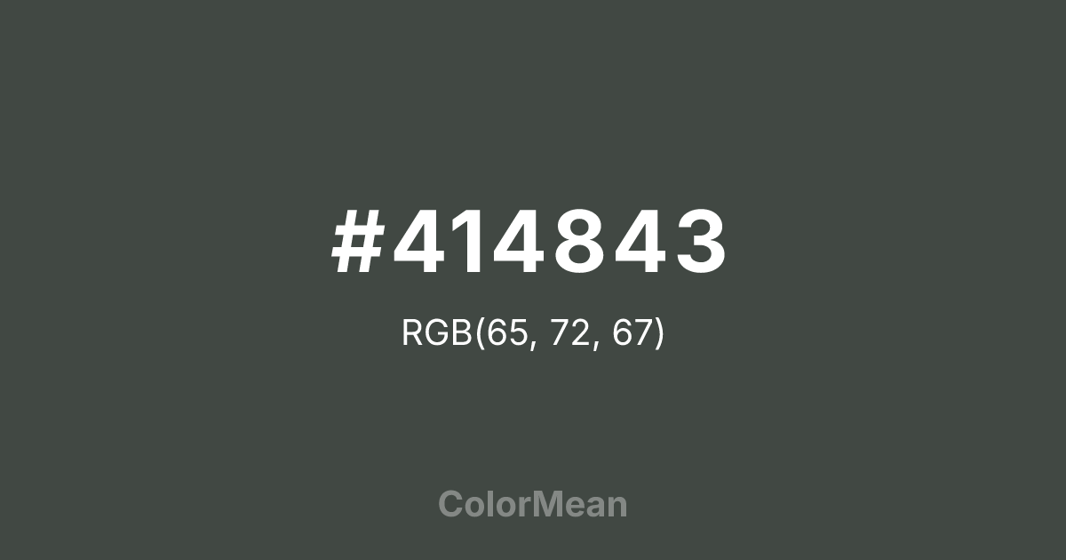#414843 RGB value is (65, 72, 67). The hex color red value is 65, green is 72, and blue is 67. Its HSL format shows a hue of 137°, saturation of 5 percent, and lightness of 27 percent. The CMYK process values are 10 percent, 0 percent, 7 percent, 72 percent.