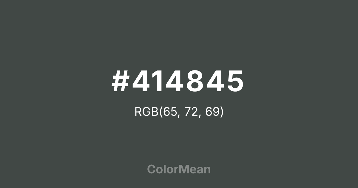 #414845 RGB value is (65, 72, 69). The hex color red value is 65, green is 72, and blue is 69. Its HSL format shows a hue of 154°, saturation of 5 percent, and lightness of 27 percent. The CMYK process values are 10 percent, 0 percent, 4 percent, 72 percent.