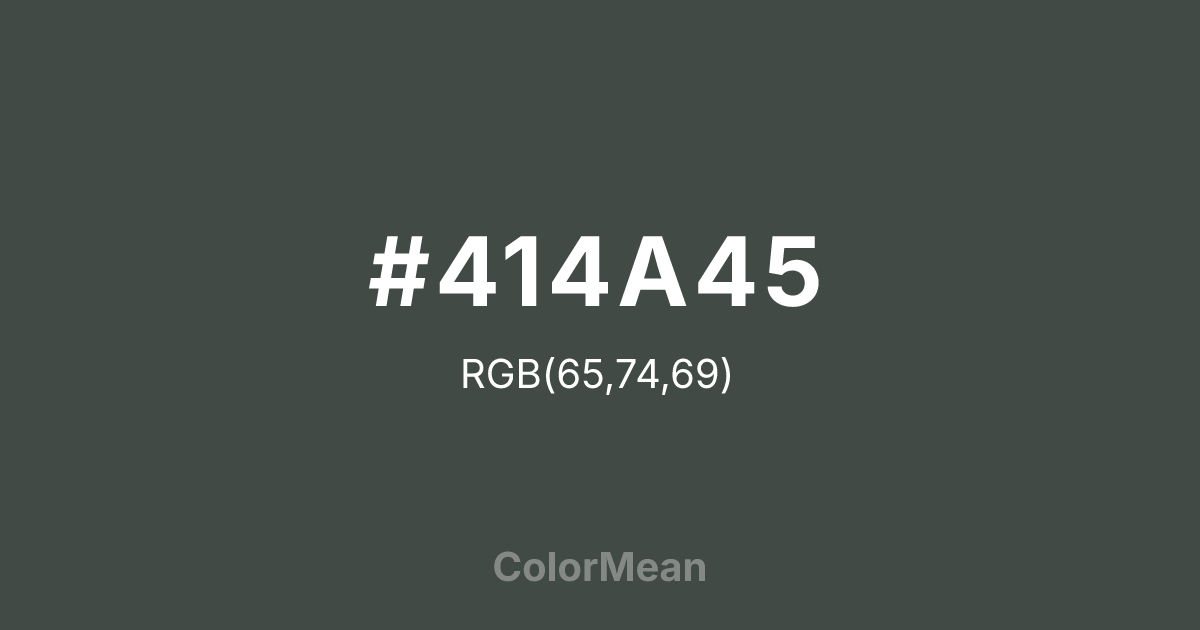 #414A45 RGB value is (65, 74, 69). The hex color red value is 65, green is 74, and blue is 69. Its HSL format shows a hue of 147°, saturation of 6 percent, and lightness of 27 percent. The CMYK process values are 12 percent, 0 percent, 7 percent, 71 percent.