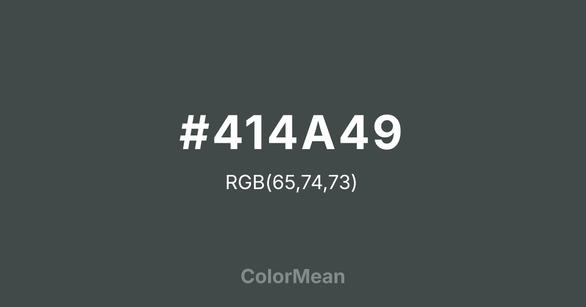 #414A49 RGB value is (65, 74, 73). The hex color red value is 65, green is 74, and blue is 73. Its HSL format shows a hue of 173°, saturation of 6 percent, and lightness of 27 percent. The CMYK process values are 12 percent, 0 percent, 1 percent, 71 percent.