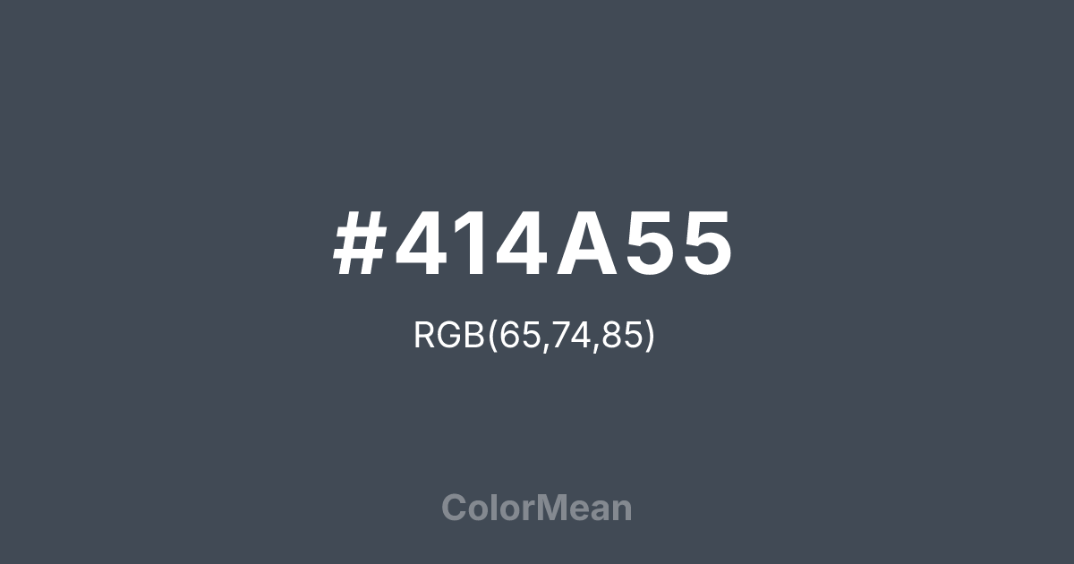 #414A55 RGB value is (65, 74, 85). The hex color red value is 65, green is 74, and blue is 85. Its HSL format shows a hue of 213°, saturation of 13 percent, and lightness of 29 percent. The CMYK process values are 24 percent, 13 percent, 0 percent, 67 percent.