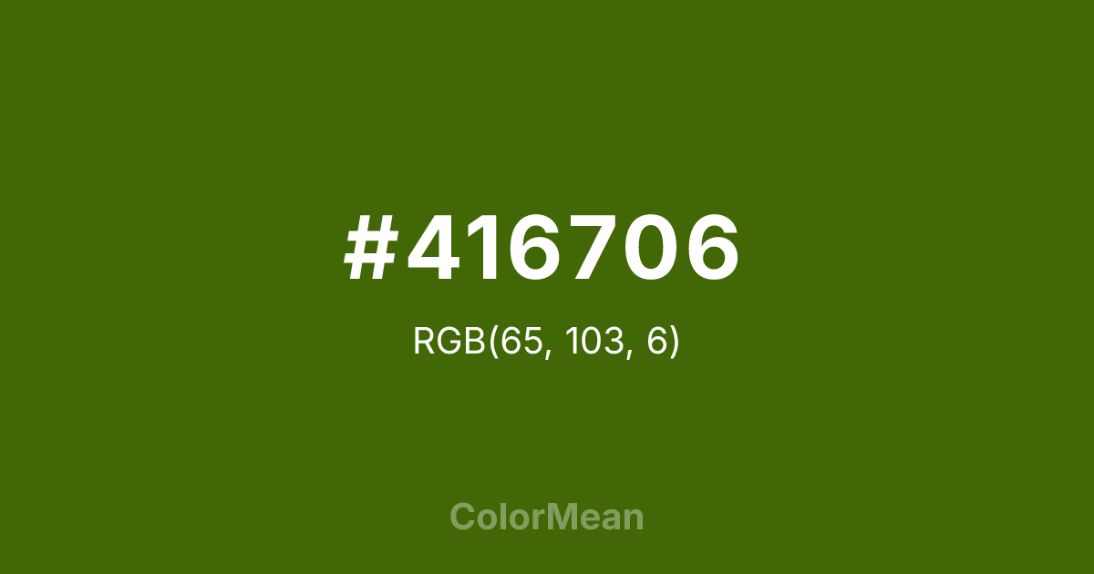 #416706 RGB value is (65, 103, 6). The hex color red value is 65, green is 103, and blue is 6. Its HSL format shows a hue of 84°, saturation of 89 percent, and lightness of 21 percent. The CMYK process values are 37 percent, 0 percent, 94 percent, 60 percent.