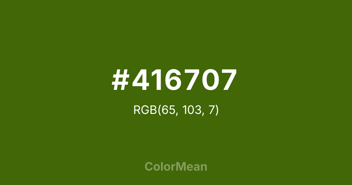 #416707 RGB value is (65, 103, 7). The hex color red value is 65, green is 103, and blue is 7. Its HSL format shows a hue of 84°, saturation of 87 percent, and lightness of 22 percent. The CMYK process values are 37 percent, 0 percent, 93 percent, 60 percent.