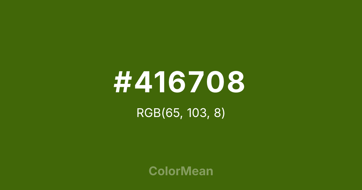 #416708 RGB value is (65, 103, 8). The hex color red value is 65, green is 103, and blue is 8. Its HSL format shows a hue of 84°, saturation of 86 percent, and lightness of 22 percent. The CMYK process values are 37 percent, 0 percent, 92 percent, 60 percent.