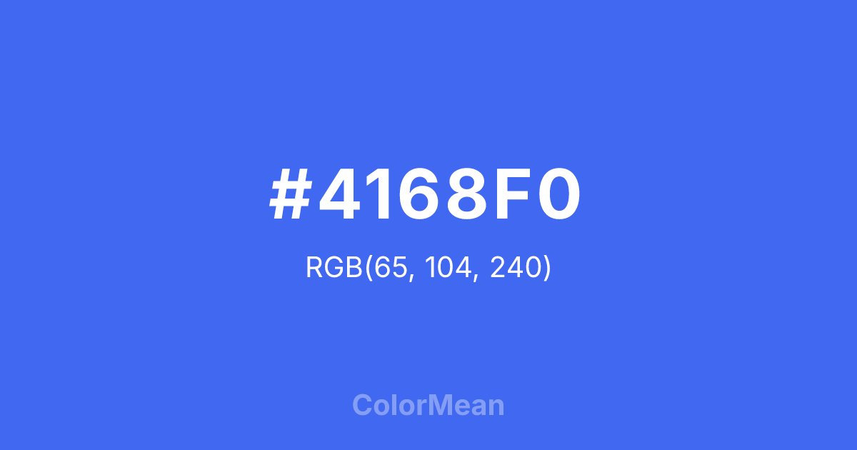 #4168F0 RGB value is (65, 104, 240). The hex color red value is 65, green is 104, and blue is 240. Its HSL format shows a hue of 227°, saturation of 85 percent, and lightness of 60 percent. The CMYK process values are 73 percent, 57 percent, 0 percent, 6 percent.