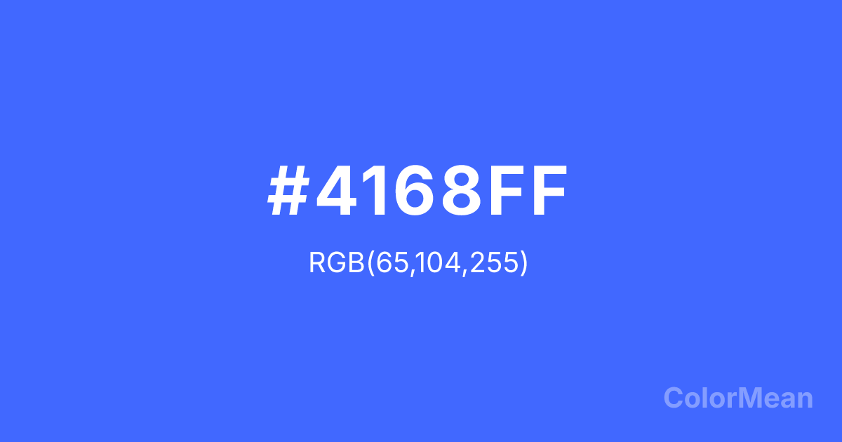 #4168FF RGB value is (65, 104, 255). The hex color red value is 65, green is 104, and blue is 255. Its HSL format shows a hue of 228°, saturation of 100 percent, and lightness of 63 percent. The CMYK process values are 75 percent, 59 percent, 0 percent, 0 percent.