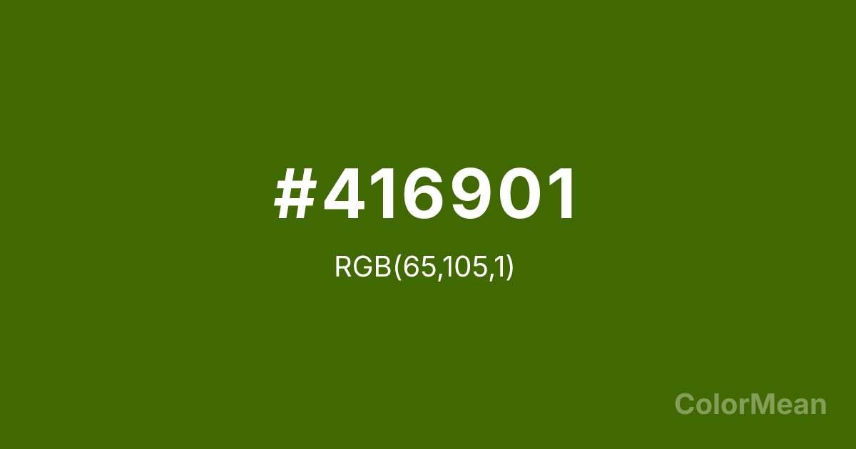 #416901 RGB value is (65, 105, 1). The hex color red value is 65, green is 105, and blue is 1. Its HSL format shows a hue of 83°, saturation of 98 percent, and lightness of 21 percent. The CMYK process values are 38 percent, 0 percent, 99 percent, 59 percent.
