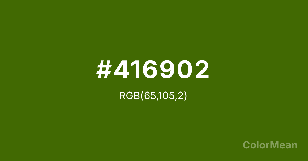 #416902 RGB value is (65, 105, 2). The hex color red value is 65, green is 105, and blue is 2. Its HSL format shows a hue of 83°, saturation of 96 percent, and lightness of 21 percent. The CMYK process values are 38 percent, 0 percent, 98 percent, 59 percent.