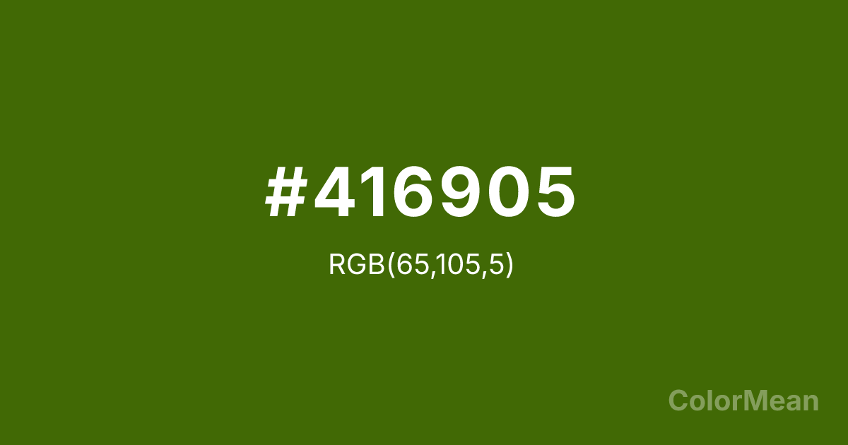 #416905 RGB value is (65, 105, 5). The hex color red value is 65, green is 105, and blue is 5. Its HSL format shows a hue of 84°, saturation of 91 percent, and lightness of 22 percent. The CMYK process values are 38 percent, 0 percent, 95 percent, 59 percent.