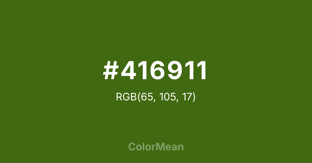 #416911 RGB value is (65, 105, 17). The hex color red value is 65, green is 105, and blue is 17. Its HSL format shows a hue of 87°, saturation of 72 percent, and lightness of 24 percent. The CMYK process values are 38 percent, 0 percent, 84 percent, 59 percent.