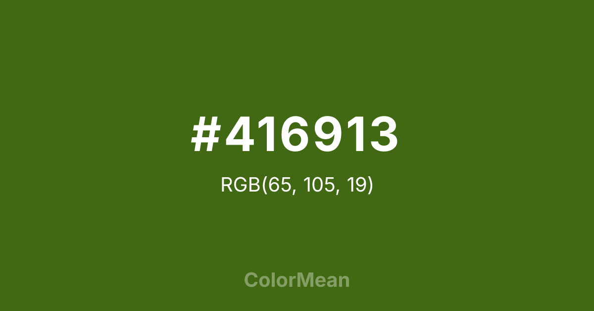 #416913 RGB value is (65, 105, 19). The hex color red value is 65, green is 105, and blue is 19. Its HSL format shows a hue of 88°, saturation of 69 percent, and lightness of 24 percent. The CMYK process values are 38 percent, 0 percent, 82 percent, 59 percent.