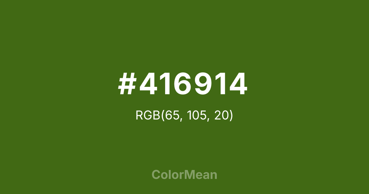 #416914 RGB value is (65, 105, 20). The hex color red value is 65, green is 105, and blue is 20. Its HSL format shows a hue of 88°, saturation of 68 percent, and lightness of 25 percent. The CMYK process values are 38 percent, 0 percent, 81 percent, 59 percent.