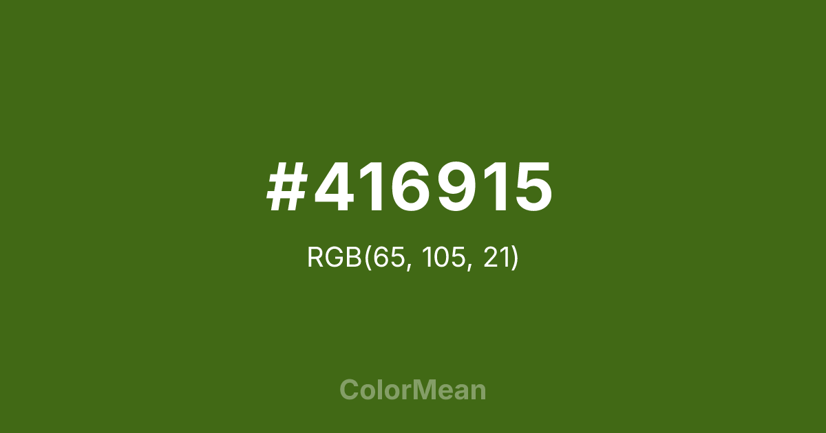 #416915 RGB value is (65, 105, 21). The hex color red value is 65, green is 105, and blue is 21. Its HSL format shows a hue of 89°, saturation of 67 percent, and lightness of 25 percent. The CMYK process values are 38 percent, 0 percent, 80 percent, 59 percent.