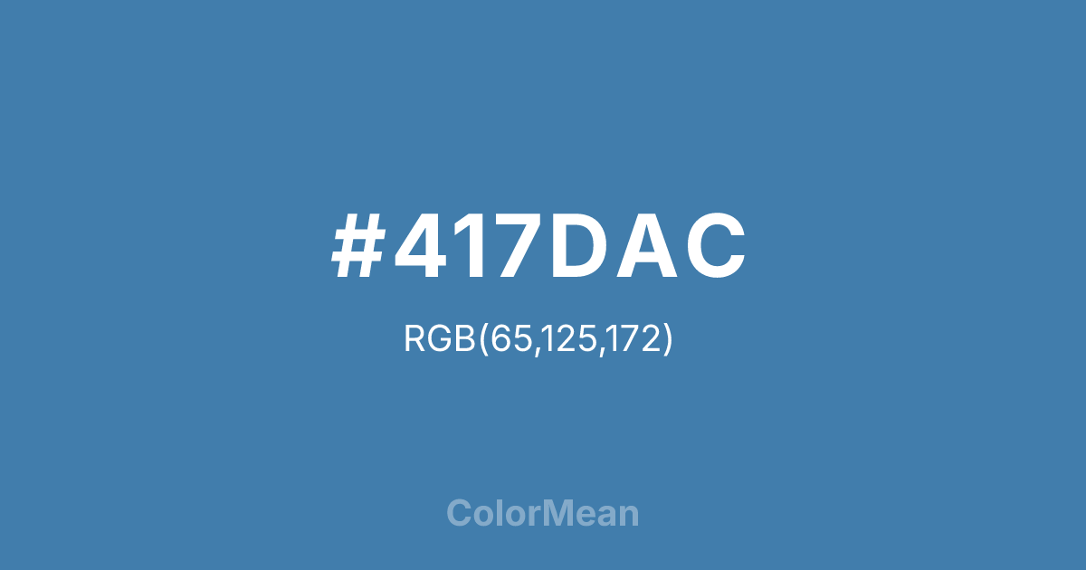 #417DAC RGB value is (65, 125, 172). The hex color red value is 65, green is 125, and blue is 172. Its HSL format shows a hue of 206°, saturation of 45 percent, and lightness of 46 percent. The CMYK process values are 62 percent, 27 percent, 0 percent, 33 percent.