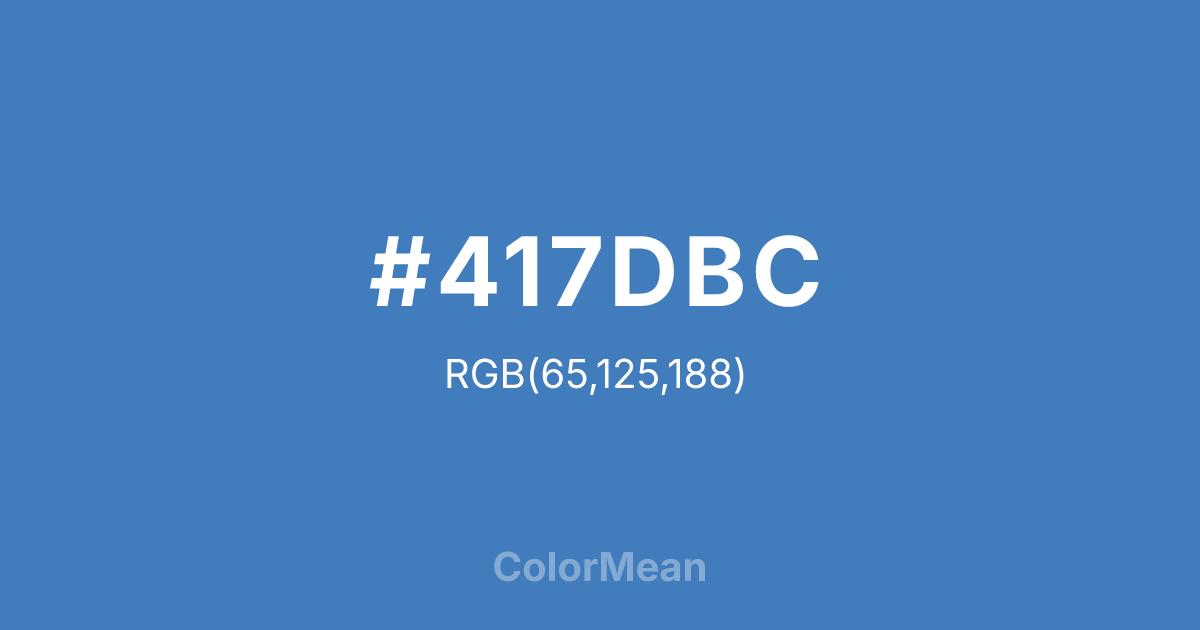 #417DBC RGB value is (65, 125, 188). The hex color red value is 65, green is 125, and blue is 188. Its HSL format shows a hue of 211°, saturation of 49 percent, and lightness of 50 percent. The CMYK process values are 65 percent, 34 percent, 0 percent, 26 percent.