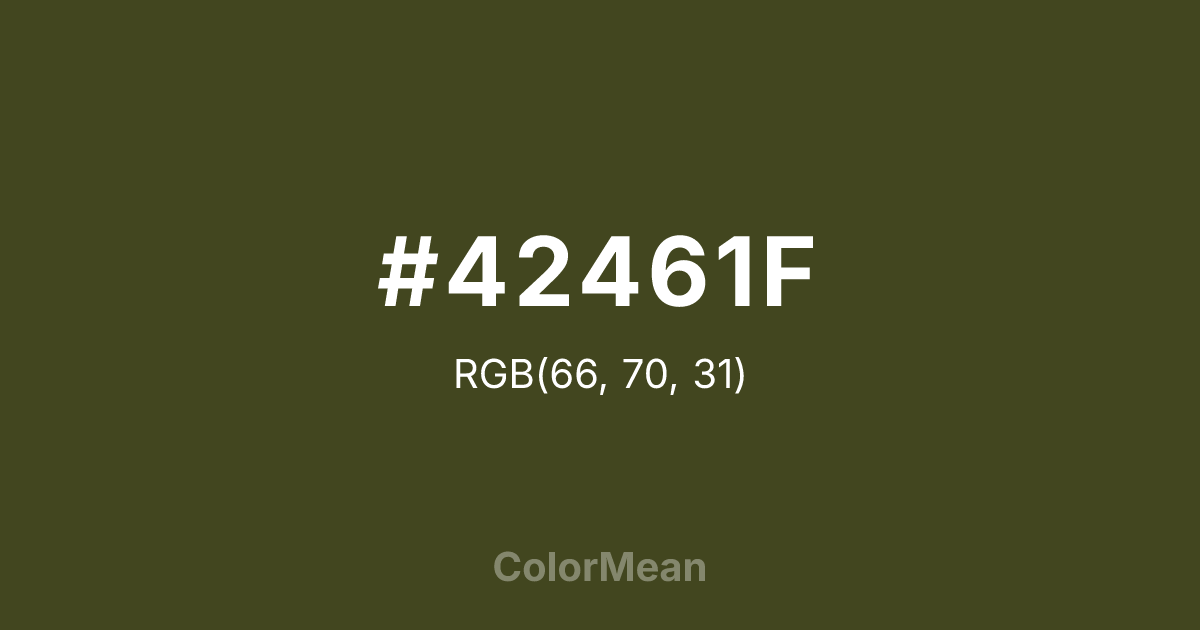 #42461F RGB value is (66, 70, 31). The hex color red value is 66, green is 70, and blue is 31. Its HSL format shows a hue of 66°, saturation of 39 percent, and lightness of 20 percent. The CMYK process values are 6 percent, 0 percent, 56 percent, 73 percent.