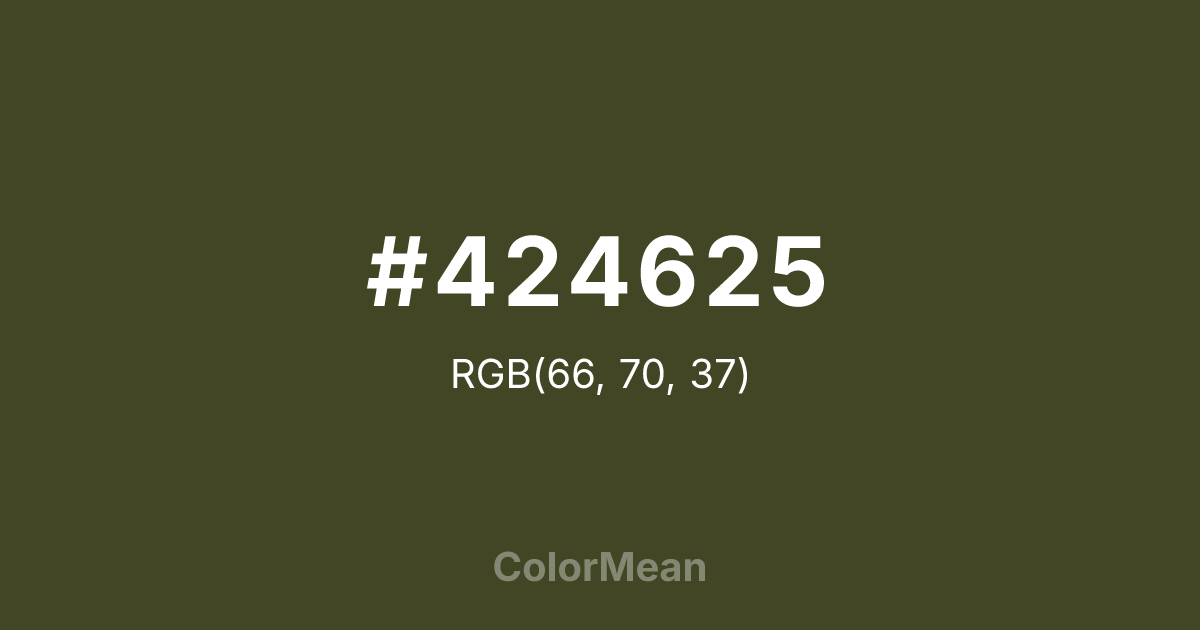 #424625 RGB value is (66, 70, 37). The hex color red value is 66, green is 70, and blue is 37. Its HSL format shows a hue of 67°, saturation of 31 percent, and lightness of 21 percent. The CMYK process values are 6 percent, 0 percent, 47 percent, 73 percent.