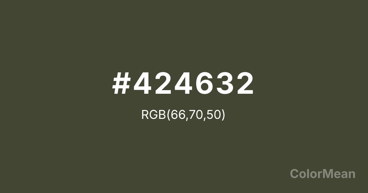 Olive Green (#424632) RGB value is (66, 70, 50). The hex color red value is 66, green is 70, and blue is 50. Its HSL format shows a hue of 72°, saturation of 17 percent, and lightness of 24 percent. The CMYK process values are 6 percent, 0 percent, 29 percent, 73 percent.