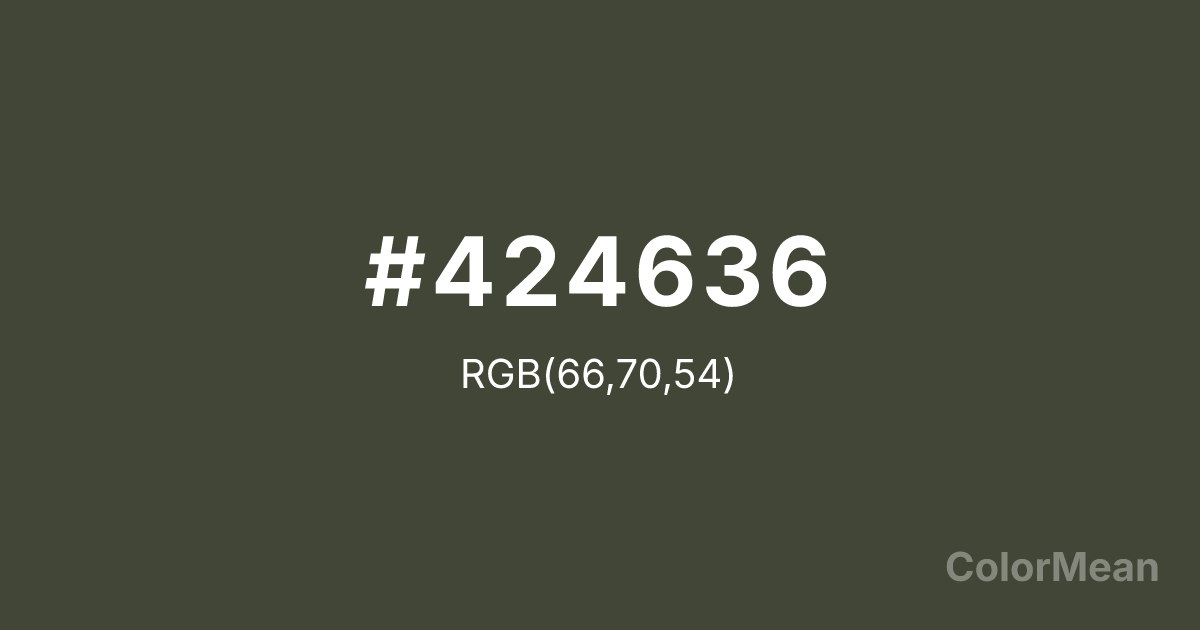 #424636 RGB value is (66, 70, 54). The hex color red value is 66, green is 70, and blue is 54. Its HSL format shows a hue of 75°, saturation of 13 percent, and lightness of 24 percent. The CMYK process values are 6 percent, 0 percent, 23 percent, 73 percent.