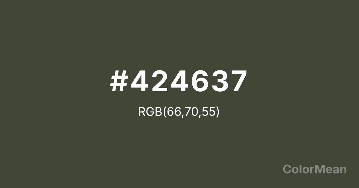 #424637 RGB value is (66, 70, 55). The hex color red value is 66, green is 70, and blue is 55. Its HSL format shows a hue of 76°, saturation of 12 percent, and lightness of 25 percent. The CMYK process values are 6 percent, 0 percent, 21 percent, 73 percent.