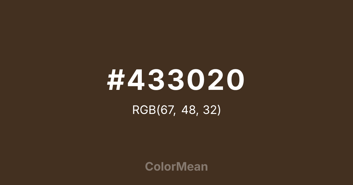 #433020 RGB value is (67, 48, 32). The hex color red value is 67, green is 48, and blue is 32. Its HSL format shows a hue of 27°, saturation of 35 percent, and lightness of 19 percent. The CMYK process values are 0 percent, 28 percent, 52 percent, 74 percent.