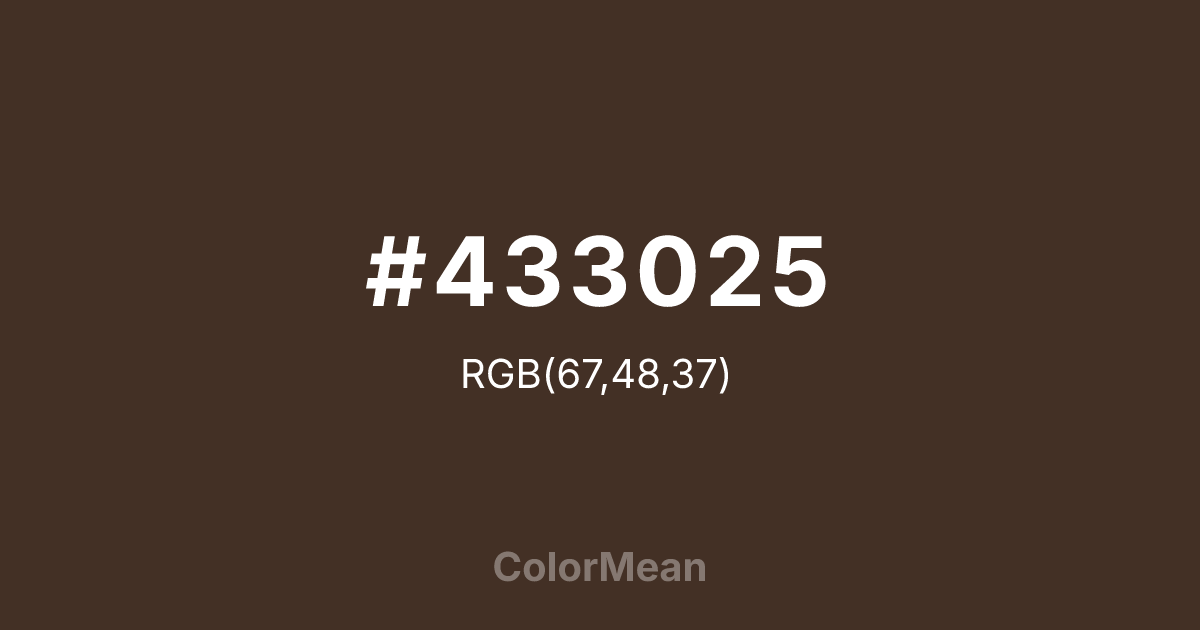 #433025 RGB value is (67, 48, 37). The hex color red value is 67, green is 48, and blue is 37. Its HSL format shows a hue of 22°, saturation of 29 percent, and lightness of 20 percent. The CMYK process values are 0 percent, 28 percent, 45 percent, 74 percent.
