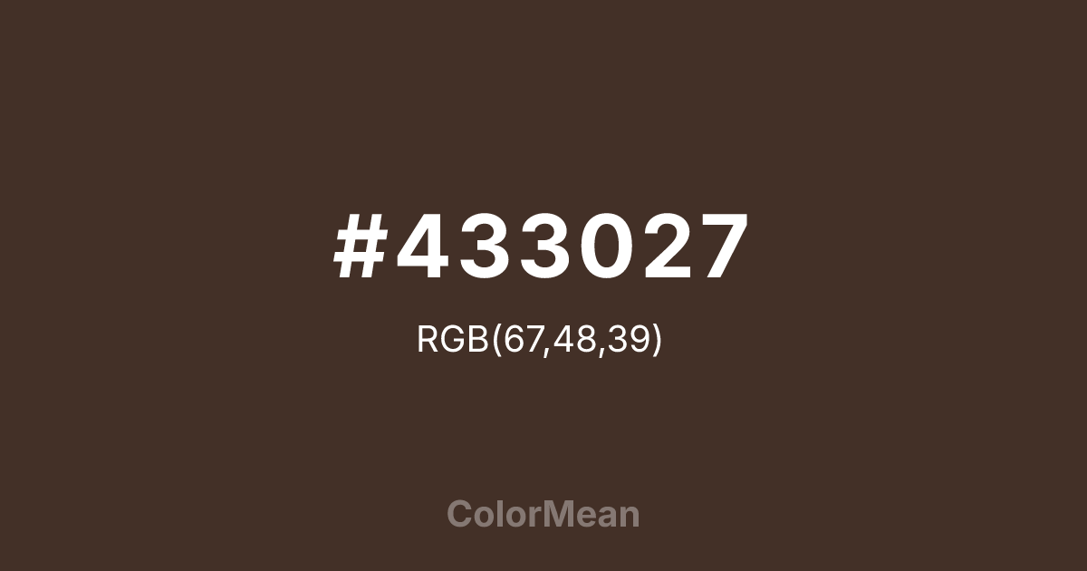 #433027 RGB value is (67, 48, 39). The hex color red value is 67, green is 48, and blue is 39. Its HSL format shows a hue of 19°, saturation of 26 percent, and lightness of 21 percent. The CMYK process values are 0 percent, 28 percent, 42 percent, 74 percent.