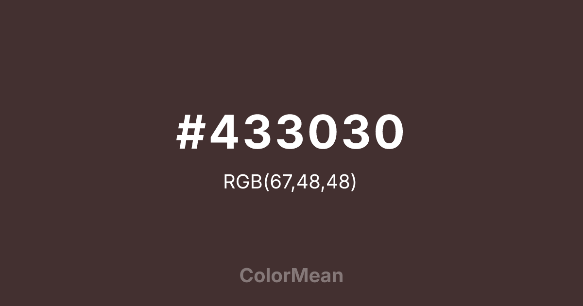 #433030 RGB value is (67, 48, 48). The hex color red value is 67, green is 48, and blue is 48. Its HSL format shows a hue of 0°, saturation of 17 percent, and lightness of 23 percent. The CMYK process values are 0 percent, 28 percent, 28 percent, 74 percent.
