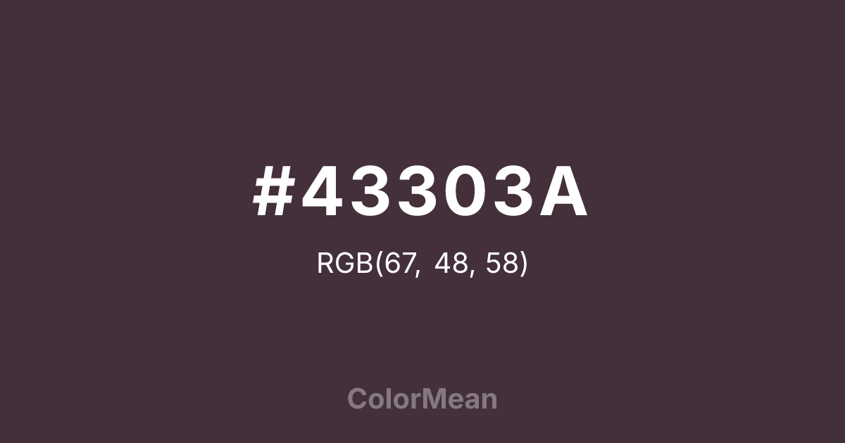 #43303A RGB value is (67, 48, 58). The hex color red value is 67, green is 48, and blue is 58. Its HSL format shows a hue of 328°, saturation of 17 percent, and lightness of 23 percent. The CMYK process values are 0 percent, 28 percent, 13 percent, 74 percent.
