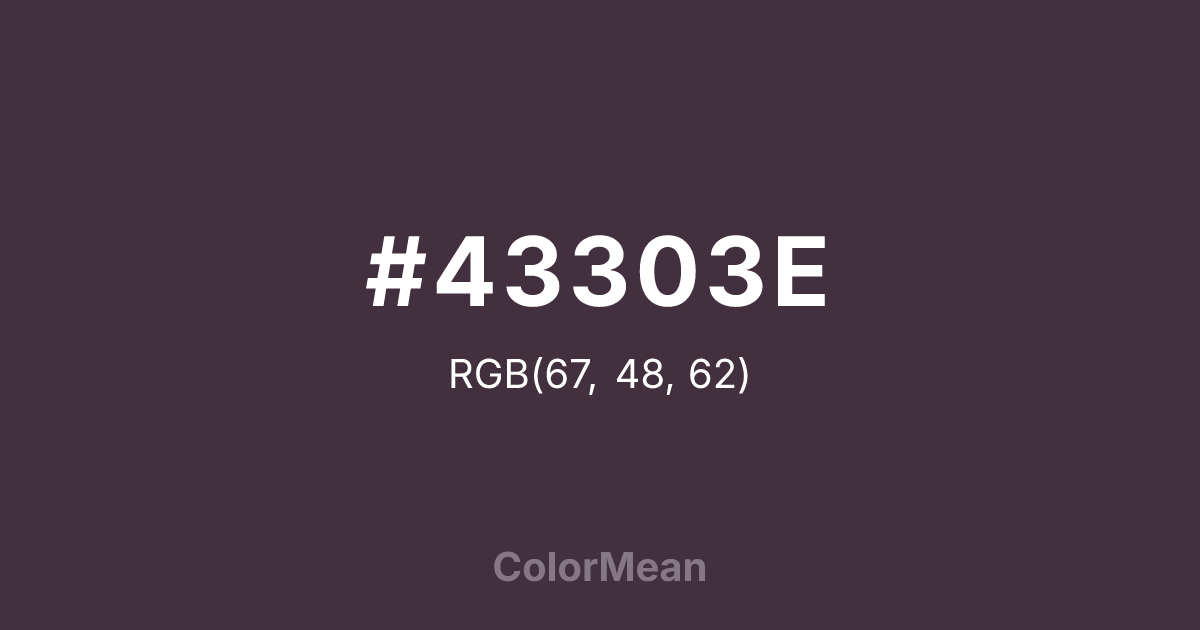 #43303E RGB value is (67, 48, 62). The hex color red value is 67, green is 48, and blue is 62. Its HSL format shows a hue of 316°, saturation of 17 percent, and lightness of 23 percent. The CMYK process values are 0 percent, 28 percent, 7 percent, 74 percent.